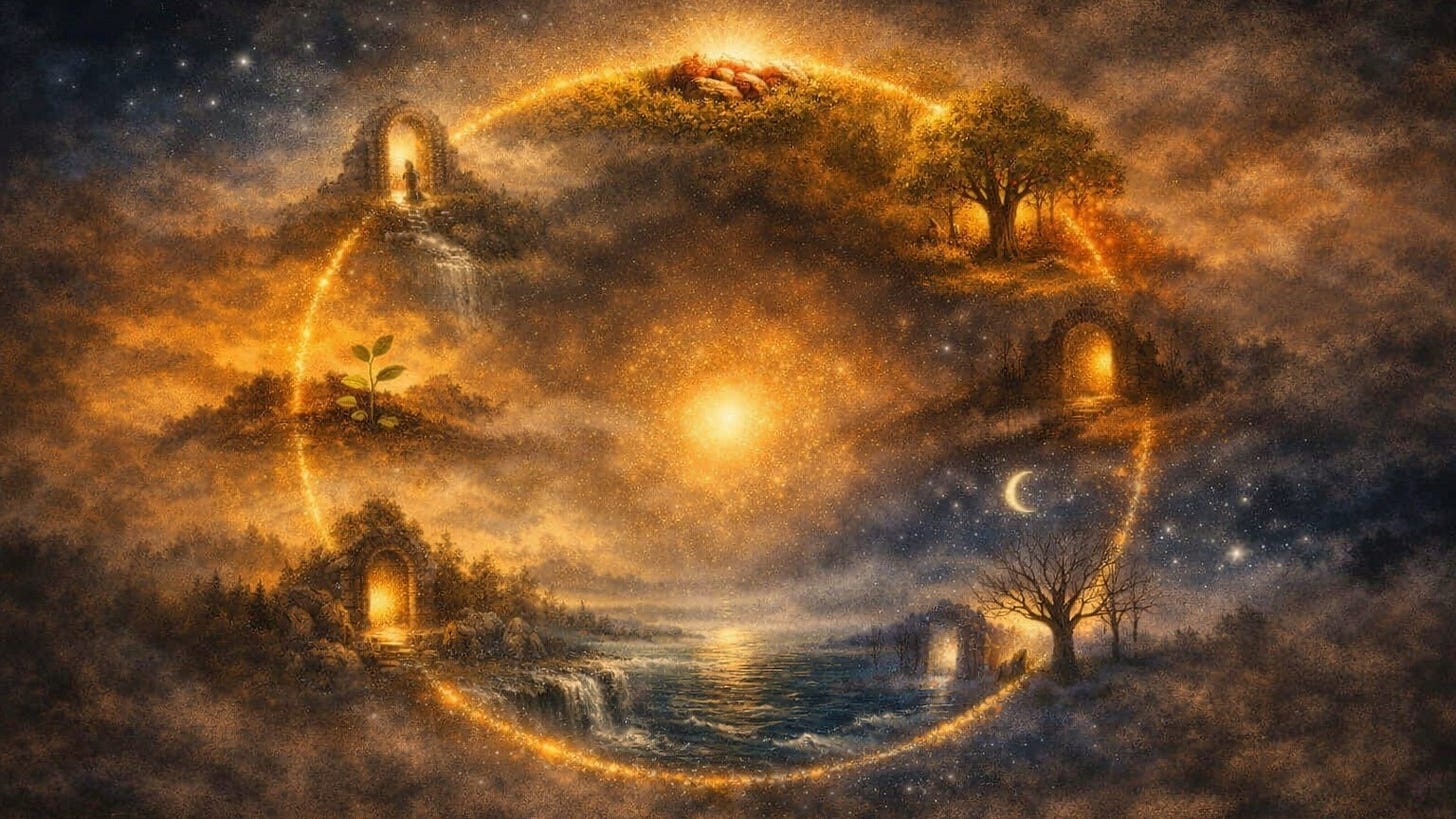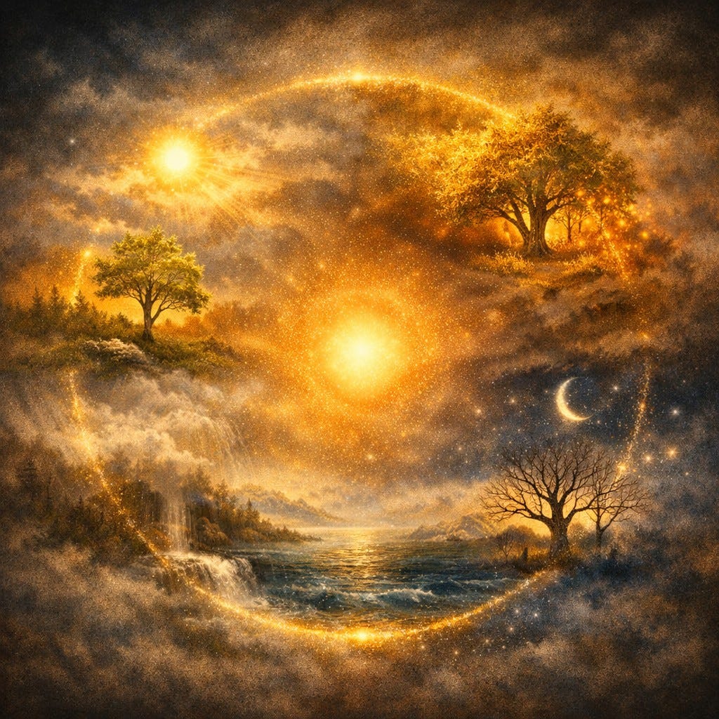 All the movements within the inner world rise and fall inside a larger rhythm. The shifting weather of emotion, the slow turning of the inner seasons, and the quiet dance of light and shadow all belong to a deeper pattern that carries us from arrival to return.